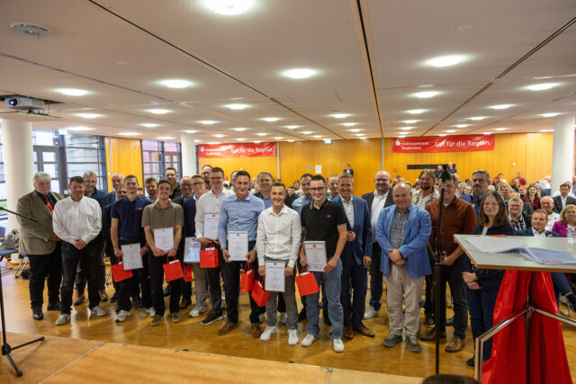 Euskirchen – Kaum ein Fahrzeug eines Handwerksbetriebs scheint ohne die Beschriftung „Kollege/Kollegin gesucht“ auf heimischen Straßen unterwegs zu sein – der Fachkräftemangel ist mittlerweile auch im Kreis Euskirchen ein großes Thema geworden. Umso mehr Aufmerksamkeit dürfte den 83 frisch losgesprochenen Gesellen und Gesellinnen zuteilwerden, die am vergangenen Dienstagabend im S-Forum der Kreissparkasse Euskirchen (KSK) gebührend für ihren erfolgreichen Abschluss gefeiert wurden. Jessica Kuhn, Geschäftsführerin der Vereinigten Kreishandwerkerschaft Düren – Euskirchen – Heinsberg, gratulierte herzlich und sagte: „Sie haben bewiesen, dass Sie den Anforderungen im Handwerk gewachsen sind – und das ist keine Kleinigkeit!“ Sie gab den jungen Handwerkern und Handwerkerinnen aber mit auf den Weg, neugierig zu bleiben und sich den wachsenden Anforderungen auch durch die weitere Digitalisierung zu stellen.