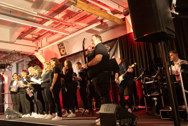 Eine besondere Überraschung hatten schließlich noch Dutzende von KSK-Mitarbeiterinnen und -Mitarbeiter für ihren scheidenden Chef. Sie hatten sich vor einem Jahr unter dem Dirigat ihres Kollegen Ben Elz zur „KSK-BENd“ zusammengeschlossen und füllten mit Chor und Musikern die komplette Bühne und dann mit ein paar Tränen der Rührung auch die Augen des scheidenden Vorstandsvorsitzenden.