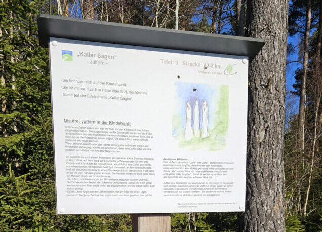 Erzählt wird an diesem Haltepunkt die Sage von den „drei Juffern“, die sich in früheren Jahren auf der Kindshardt mit langen weißen Gewändern und Tüchern über dem Kopf aufgehalten haben sollen. „Diese Juffern erschreckten nachts, lautlos erscheinend und ebenso wieder verschwindend, ahnungslose Passanten. Die Einheimischen hielten die Juffern für verwünschte Geister, die noch erlöst werden konnten. Eines Tages hat sie ein Pater verbannt und sie erschienen nicht mehr“, heißt es auf einer dort angebrachten Tafel.